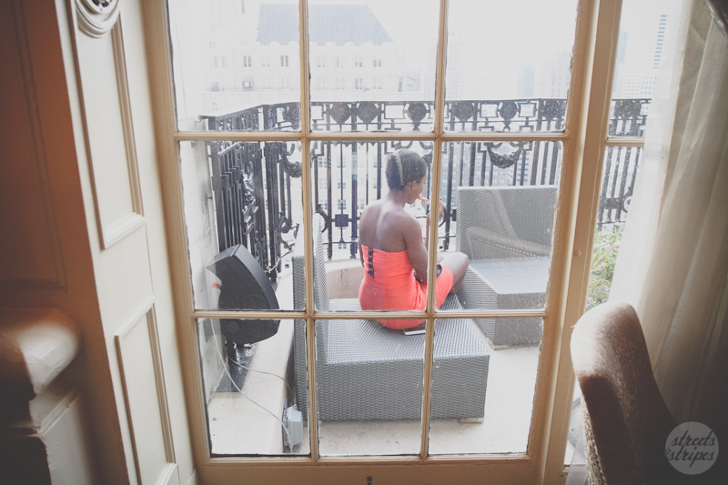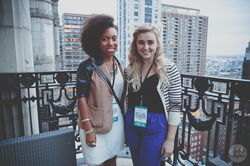 So I arrived in the cobalt blue pants, met up with Jacqui, and headed inside. Right before we walked in we realized we had forgotten to snap some photos of our outfits outside so we dashed down the 19 floors, snapped a few pics, and then headed upstairs to start covering the event. Even though the Press badges didn’t go with our outfits, they hung dutifully around our necks so people wouldn’t think we were some weirdos with a camera (as if they already didn’t get that from my bright blue pants).